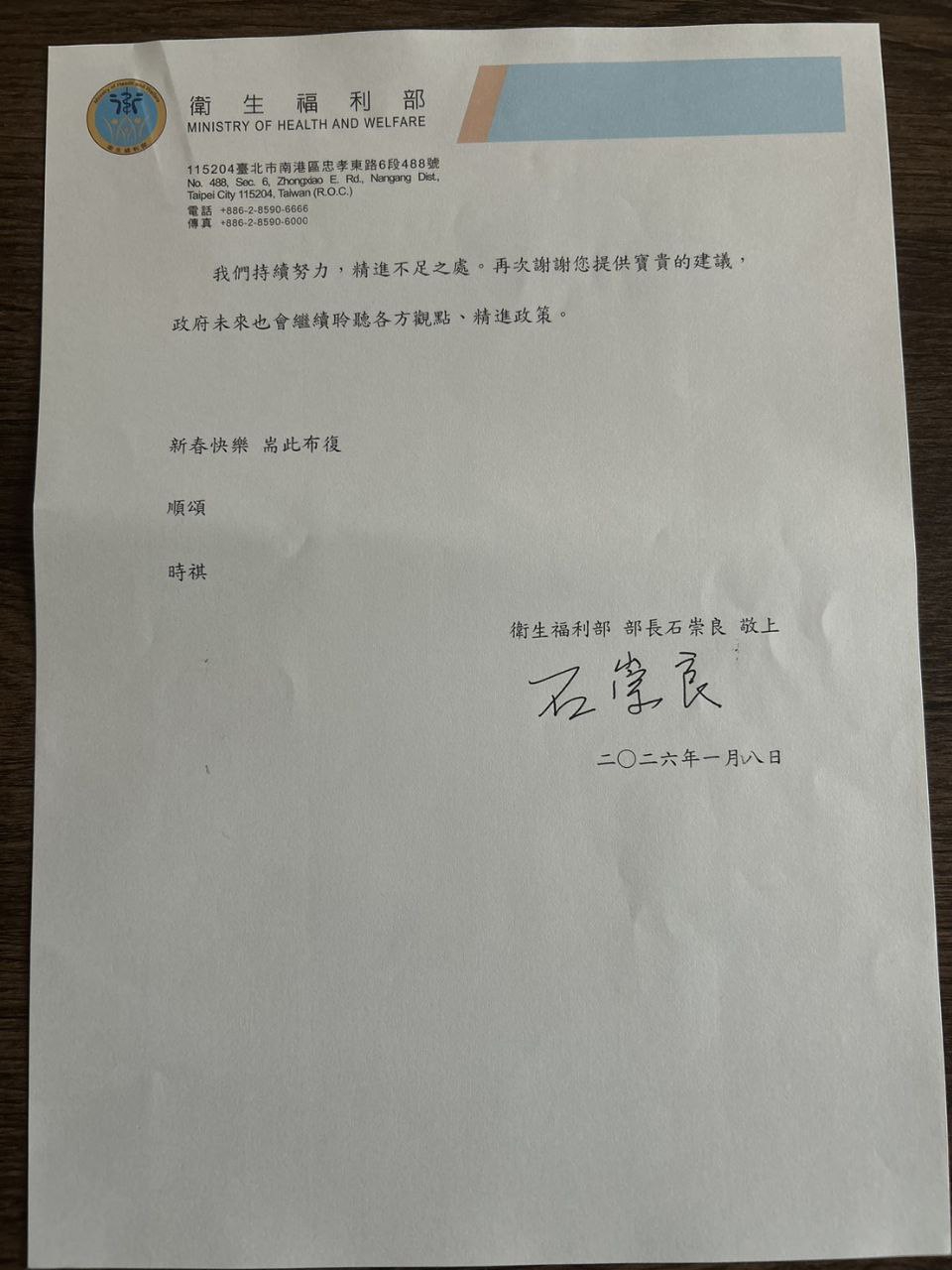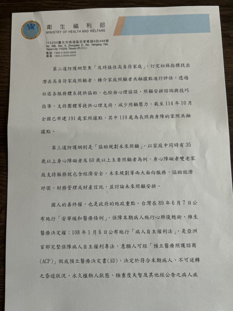 日前收到衛生福利部針對「8050」長照家庭壓力及「善終權」議題的回覆,本人對政府願意正視高齡社會下的民生痛點,衛生福利部也積極回信,表達誠摯的肯定。
