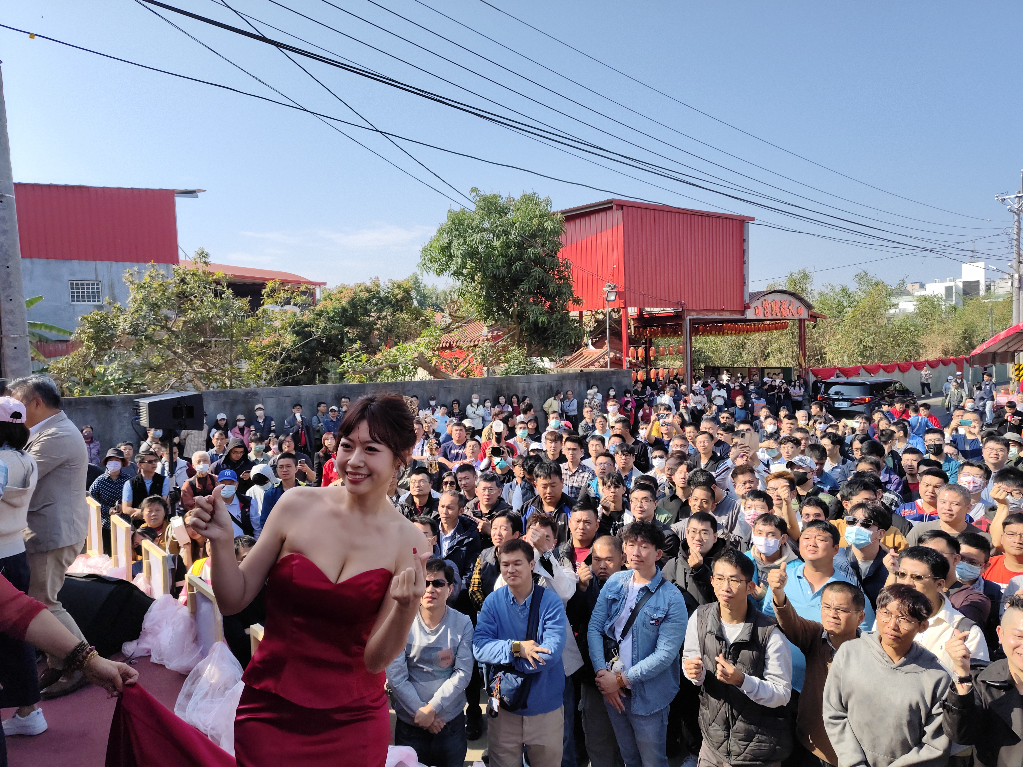 (記者任芳葵嘉義報導)嘉邑大福興宮月老祖廟年度拋繡球徵友聯誼,年初五在廟前廣場熱鬧舉行,今年報名人數較往年倍增成長,未婚男女熱情參與,知名女網紅柯莉絲汀身穿大紅性感禮服拋球,台下男士爭相搶奪成為全場焦點,新春系列活動在歡樂熱烈氣氛中圓滿落幕。