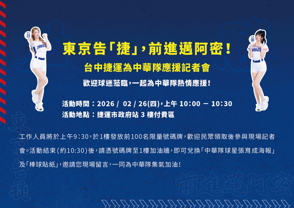 【記者林獻元台中報導】2026年世界棒球經典賽(WBC)開戰在即,台中捷運公司將於2月26日上午10點在中捷市政府站正式啟動「東京告『捷』,前進邁阿密!」系列應援活動,邀請球迷一起為中華隊集氣。當天前100位到場參加記者會並在加油留言牆寫下祝福的球迷,即可獲得中華隊球星張育成簽名海報,希望藉由大家的祝福,為中華隊注入滿滿能量。