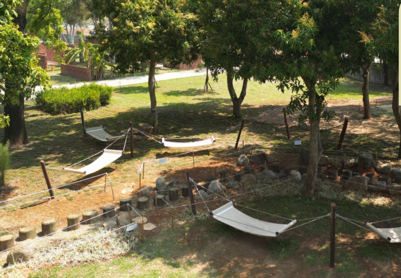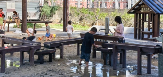 「在自然中遊戲-台中后里森林自然遊戲場」則保留原有林木風貌,導入自然素材與地形地貌,設置猴森堡壘、林間吊床及森林挑戰區,打造全台首座以自然體驗為核心的森林遊戲場,實踐全齡共享與環境教育理念。