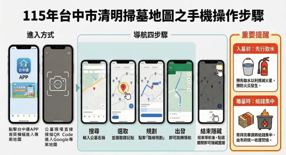 台中市生命禮儀管理處補充,民眾可於台中通APP首頁點選「台中市清明掃墓地圖」橫幅,或掃描專屬QR Code進入Google專案地圖,在搜尋欄輸入公墓名稱,點選紙錢集中處或消防水袋圖示後按下「路線規劃」,即可啟動導航。