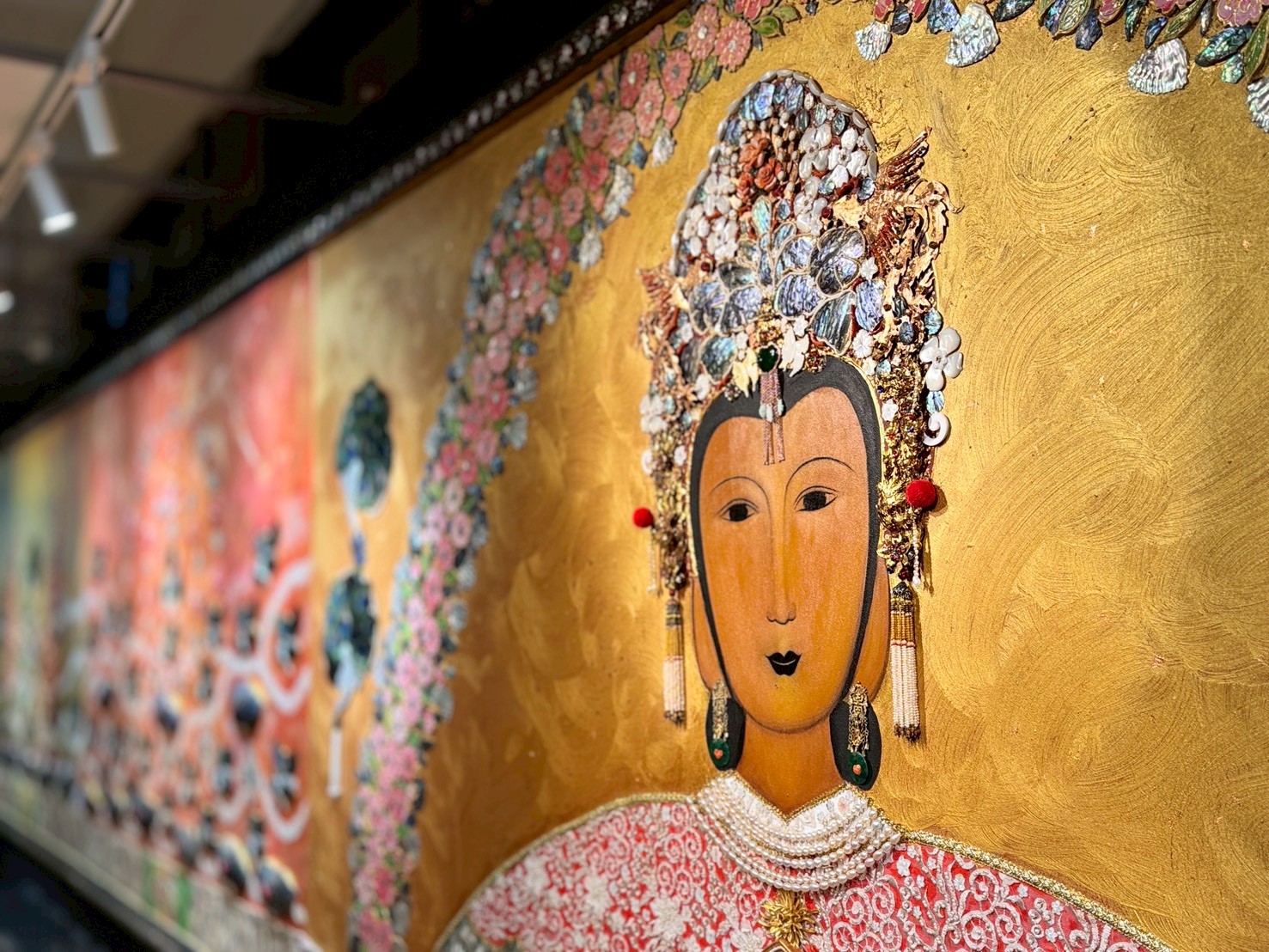 展覽最大亮點之一,是全台首件運用傳統螺鈿工藝創作的巨型媽祖藝術作品。作品全長達1080公分,歷時一年完成,將貝殼材質細緻鑲嵌於畫面之中,在光線折射下呈現出絢麗光澤,展現傳統工藝與現代藝術融合的創新表現。