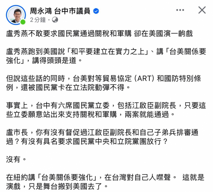 周永鴻表示,盧秀燕赴美說「和平要建立在實力之上」、講「台美關係要強化」,講得頭頭是道,但台美對等貿易協定(ART)和國防特別條例,至今仍被國民黨卡在立法院動彈不得。