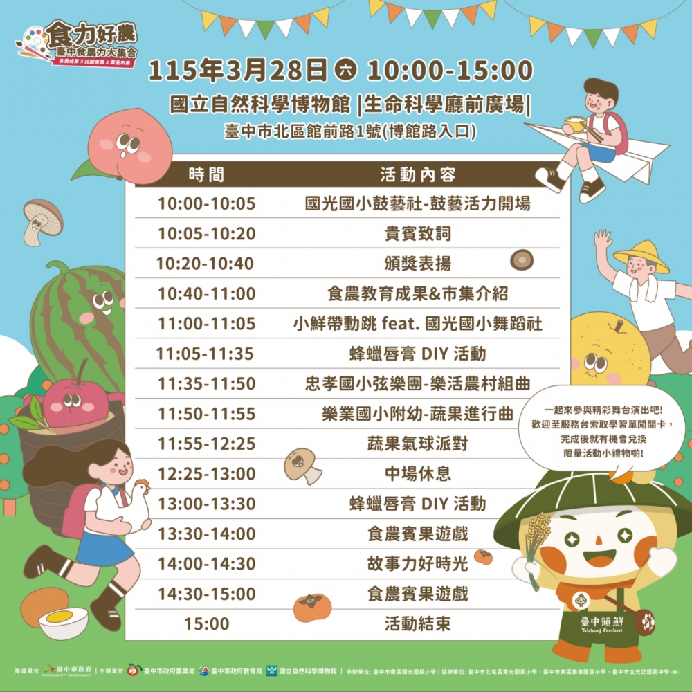 【記者侯帥伍、邱金傍豐原報導】為展現台中市推動校園食農教育的豐碩成果,市府教育局攜手農業局與國立自然科學博物館,於3月28日週六上午10時,在科博館生命科學廳前廣場舉辦「115年台中市食農教育成果展暨校園食農教育嘉年華」。活動結合校園成果展示、互動體驗及舞台表演,透過多元有趣的方式呈現校園食農教育的豐富樣貌,邀請市民一同參與。