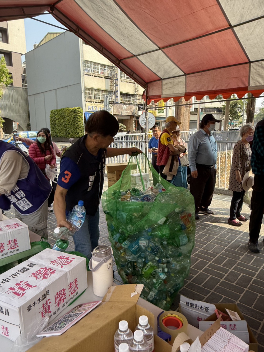這次選在文財廟前廣場登場,邀請民眾一同參與綠化家園的行列。活動以「3個空寶特瓶,兌換2株樹苗」的方式進行。