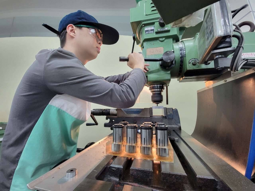 對建霖而言,技術不只是競賽,更是一種家族傳承。從祖父開始家中即投入模具產業,他自小便利用假日到工廠幫忙,從鑽孔等基礎工作接觸機械加工。目前建霖就讀中彰投分署與國立勤益科技大學合作開辦的「工具機與精密模具設計製造專班」,大一在分署接受系統化職業訓練,持續精進電腦繪圖與CNC銑床加工技術。隨著大二即將進入企業實習,也意味著選手生涯進入最後階段,今年的競賽不只是挑戰成績,更是為青春留下全力以赴的印記!