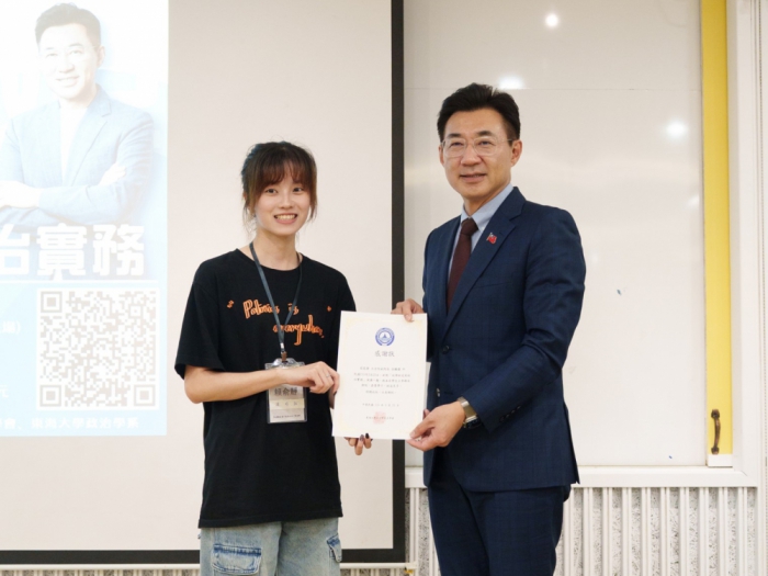 政治系主任張峻豪在致詞時感謝曾擔任大學教授的江副院長百忙之中撥冗至東海客座分享。張主任提到,政治學即是生活,江副院長的斜槓人生證明了專業知識能轉化為改變社會的動能,這對正處於探索階段的學生而言,是縮短校園與社會距離的最佳導引。江啟臣在演講最後對東海大學學生勉勵,不要害怕失敗,更要在挫折中學會「韌性」,這將會是未來生命中最珍貴、也最難在課本中學到的特質與資產。