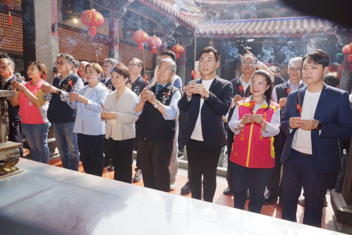 樂成宮董事長何敏誠帶領全體董監事祈求月老星君見證與賜福。(記者林獻元攝) -