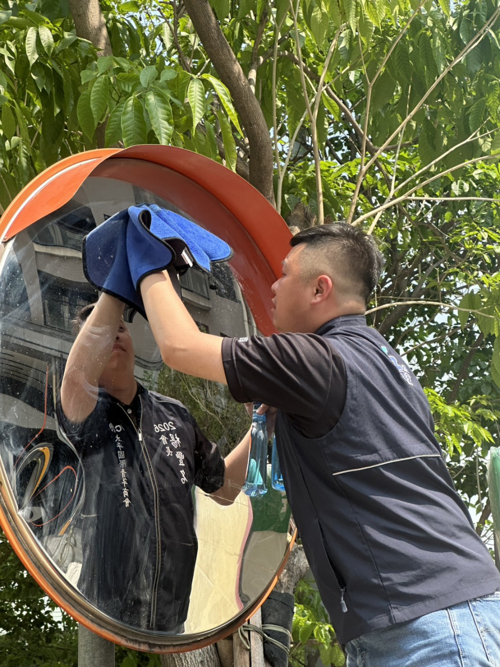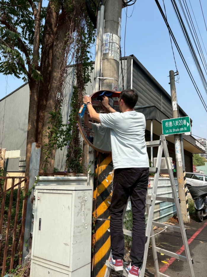 台中市太平區新高里長江姿樺表示,這次活動由鄰長領隊,分成四小隊,各隊負責一個路線,透過人力一面、一面定點擦拭反光鏡,過程中要注意車流及交通情況,也會遇到有點受損的鏡面,其實也很不容易,謝謝這些年輕人,讓里內志工隊也能參與其中,發揮在地引路功用。