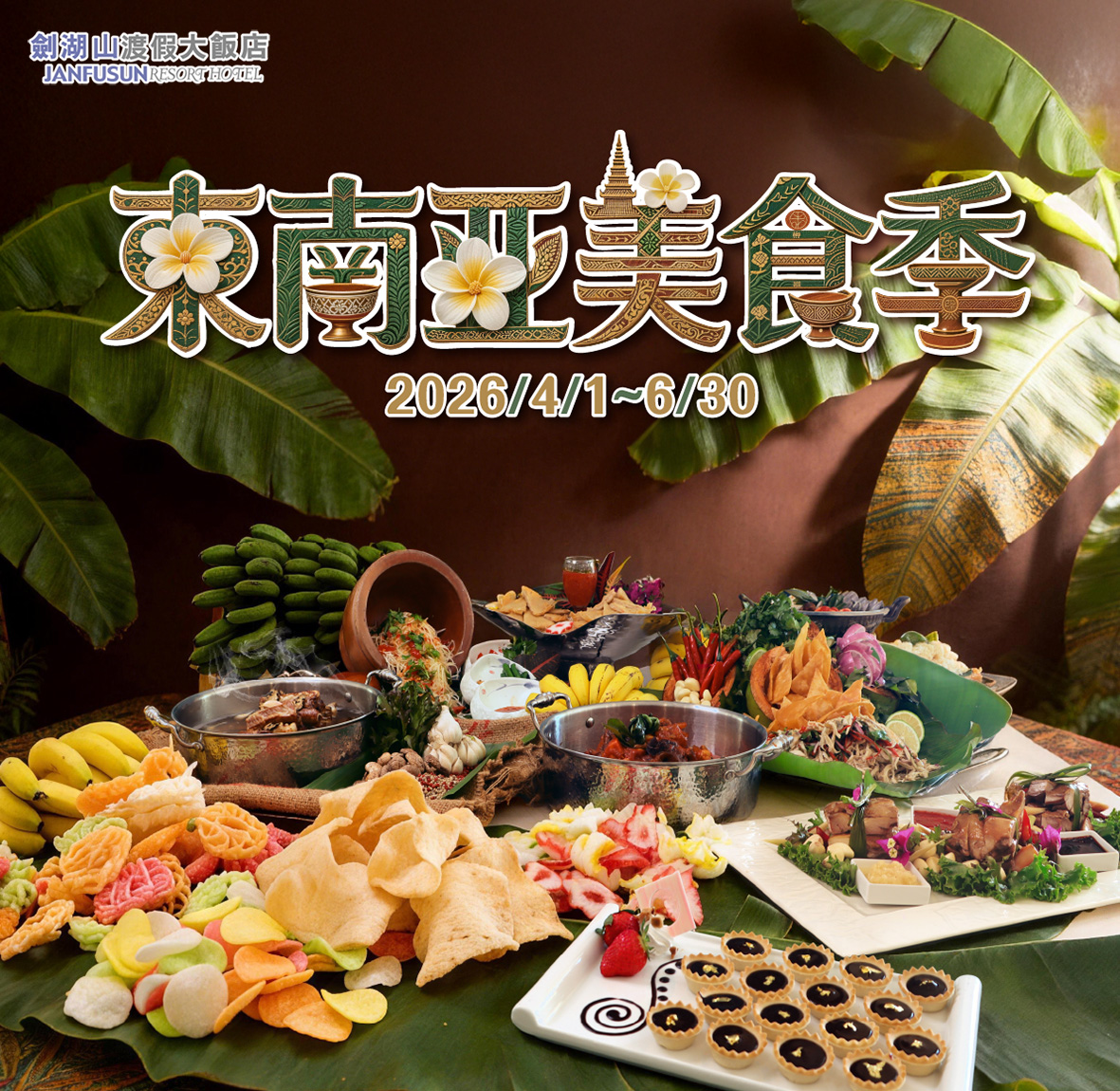 在餐飲服務方面,劍湖山渡假大飯店內「蔚藍西餐廳」推出東南亞美食節,並於清明連假期間提供親子優惠方案。成人每位850元、兒童550元、幼童450元,另規劃「2大1小」2,155元組合,提升家庭客群用餐選擇與便利性。