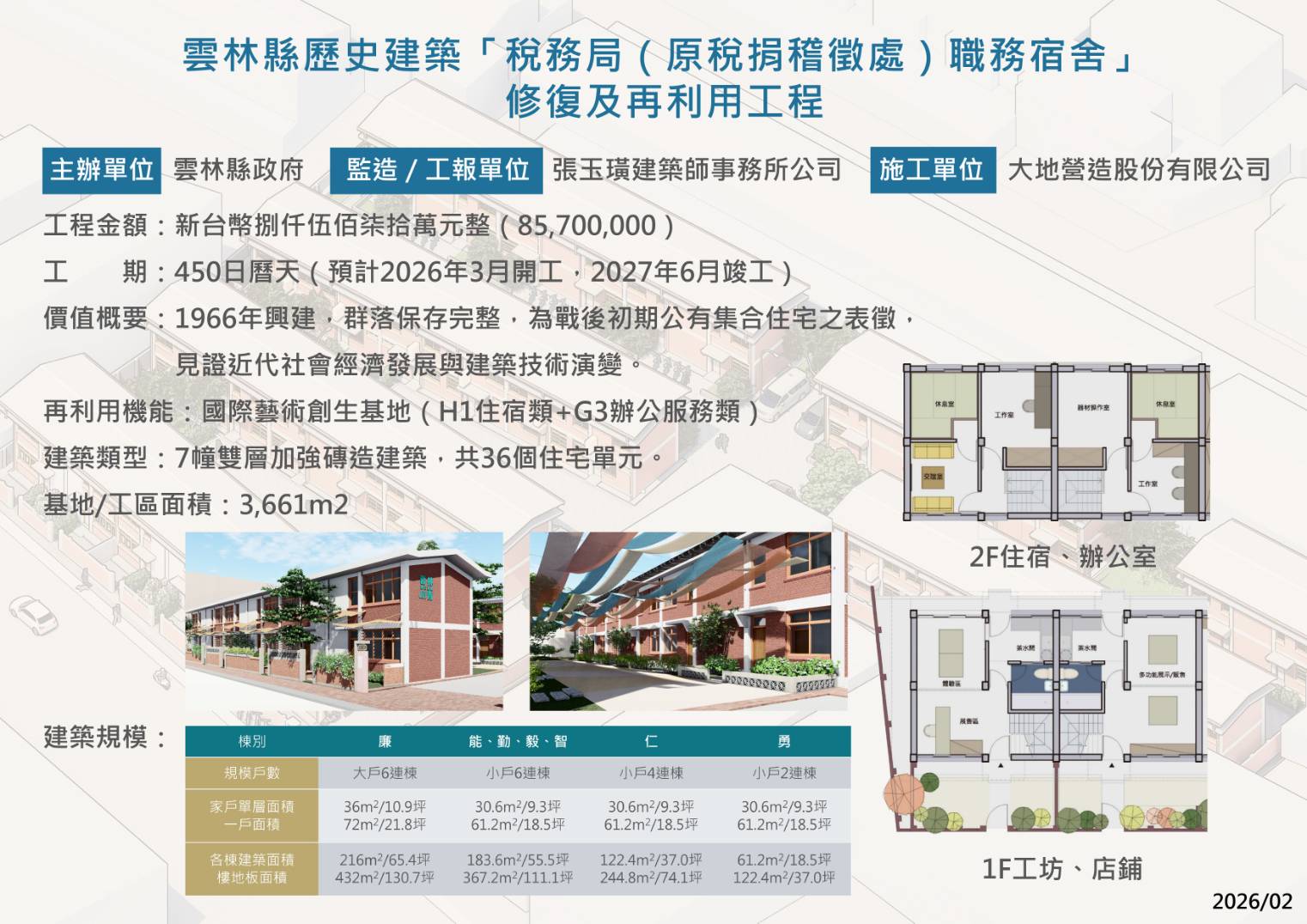 【記者 蘇峯毅/雲林 報導】斗六市文化路「稅務局職務宿舍」於今日(4/1)正式動工,雲林縣政府自籌1億784萬元投入修復工程,計畫將這座1960年代建成的歷史宿舍群,轉型為「國際藝術創生基地」,結合文化保存、創意產業與公共服務功能。