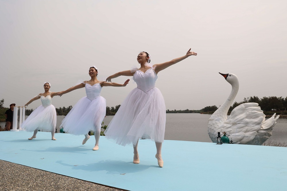 活動的焦點之一是設置在湖邊的8米高天鵝地景藝術,這個壯觀的藝術裝置不僅成為全台熱門的打卡景點,也讓遊客在享受湖景的同時,能夠更深入地體驗雲林的自然美景。開幕式上,來自當地的口湖鄉立幼兒園小朋友也參與了芭蕾舞表演,展示出純真與活力,令現場充滿溫馨與童趣。