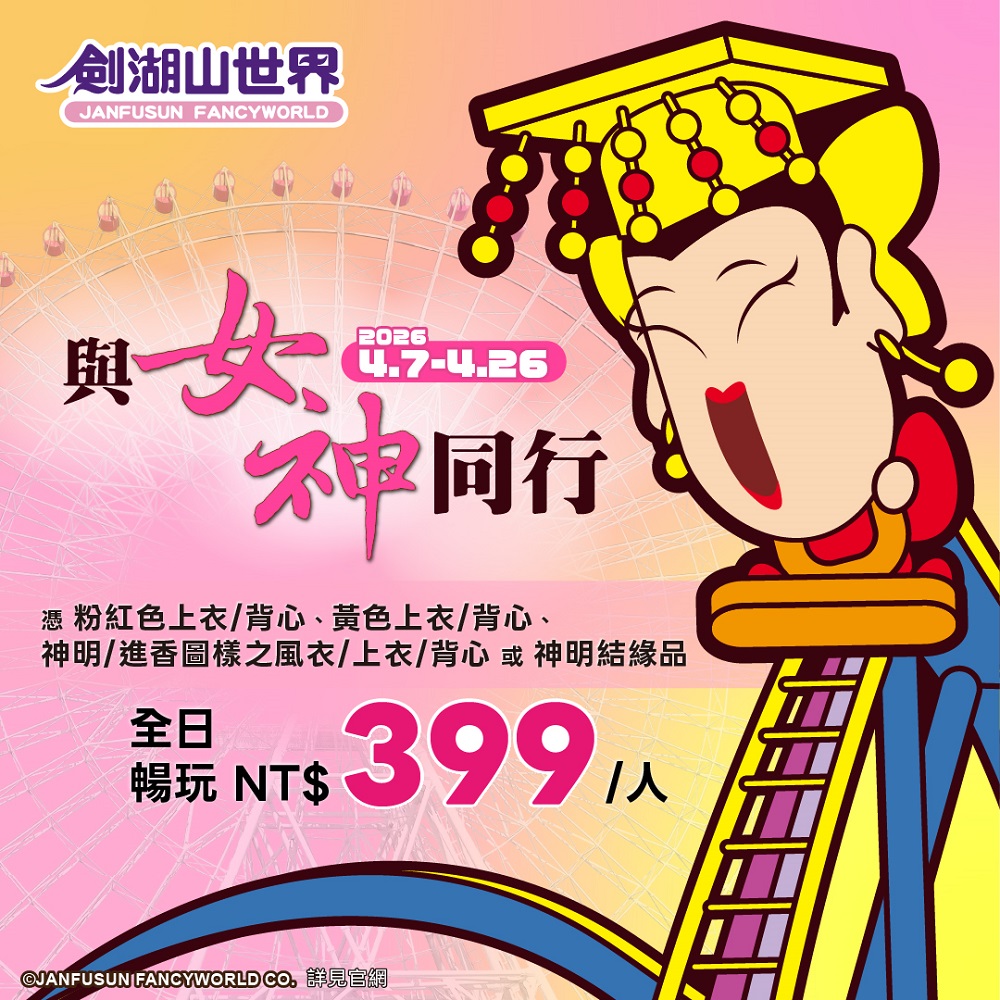 劍湖山世界自4月7日至4月26日推出「與女神同行」限時優惠,只要遊客穿著信仰元素服飾或攜帶平安符、令旗等結緣小物,即可享有門票399元優惠,吸引全台信眾朝聖。此外,針對家庭旅遊,渡假大飯店推出「春遊童樂」住宿專案,每房3,299元(每日限量7間),包含高級客房一晚、翌日自助早餐及依入住人數贈送大人三溫暖券,兼顧休閒與信仰體驗。