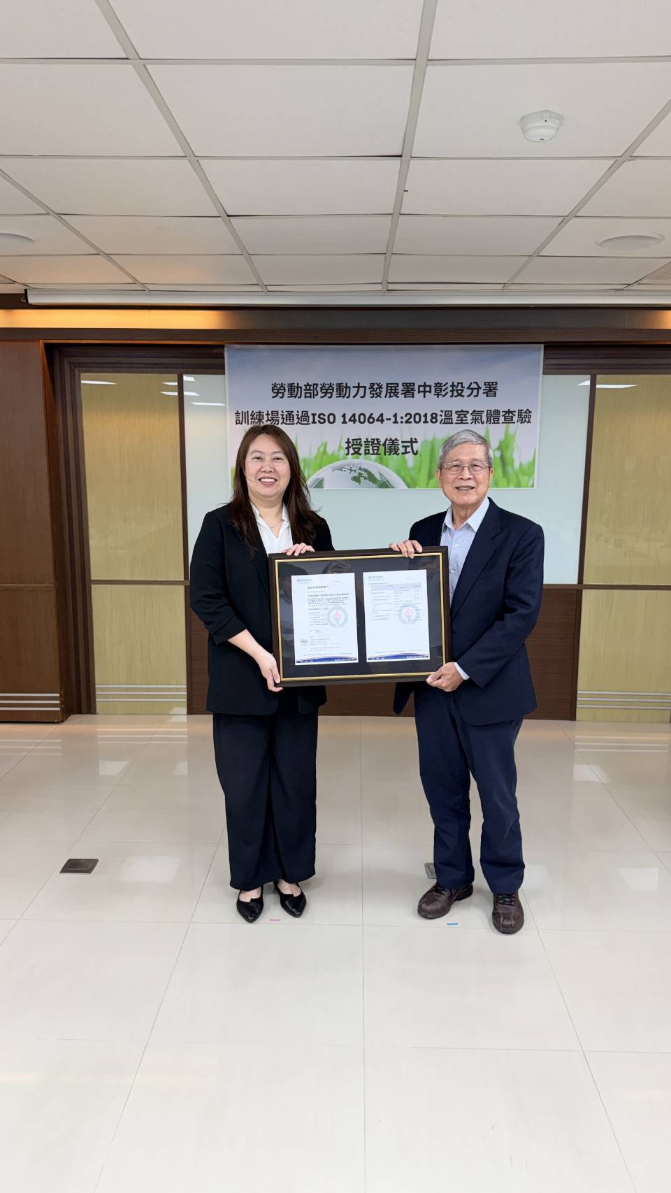 【記者張原銘、張皓傑台中報導】為響應國家2050淨零排放政策與產業淨零轉型趨勢,勞動部勞動力發展署中彰投分署積極推動訓練場域淨零轉型,並將永續理念融入人才培育。該分署近日完成臺中訓練場及彰化勞動學苑溫室氣體盤查,率先通過ISO 14064-1溫室氣體盤查國際認證,於7日舉行授證儀式,由查驗機構台灣中油公司綠能科技研究所所長呂國旭頒發查驗證書,並由分署長劉秀貞代表接受。中彰投分署以訓練場域率先實踐減碳行動,展現推動淨零轉型與培育綠領人才的決心,持續強化職業訓練體系的永續發展。