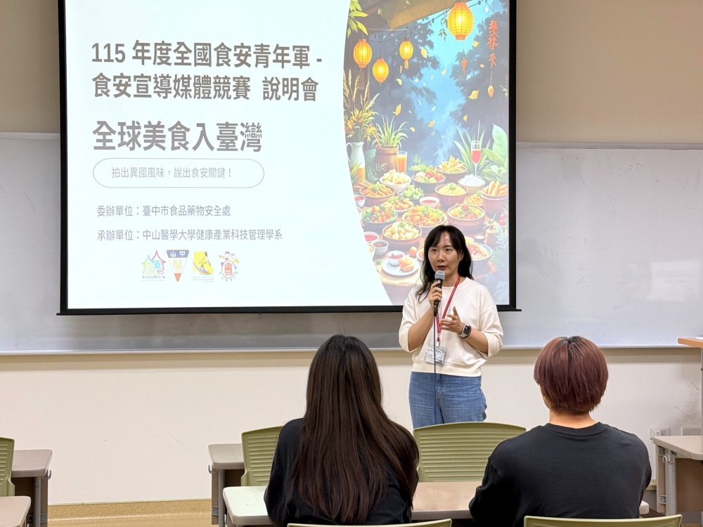 【記者張原銘、張皓傑台中報導】為提升國人對異國料理進口食材來源及製程保存的正確食安認知,由臺中市食品藥物安全處主辦、中山醫學大學健康產業科技管理學系承辦的「115年度全國食安青年軍食安(農)宣導媒體競賽」於8日下午舉辦說明會,並同時為競賽揭開序幕。今年以「全球美食入臺灣」為主題,祭出總獎金新台幣10萬元,號召全國大專校院學生以影像創作呈現異國風味,同時傳遞食品安全與食農教育的重要觀念。