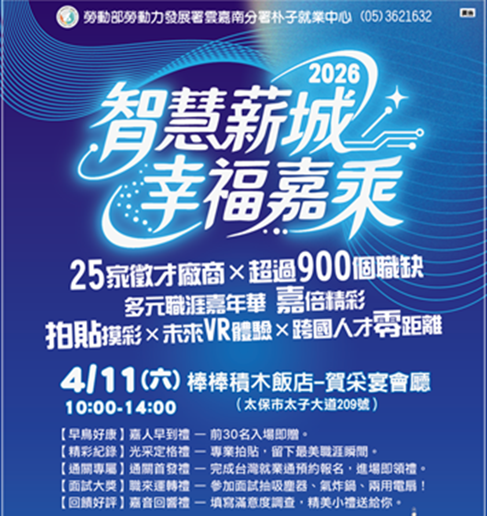 朴子就業中心將於4月11日舉辦「2026智慧薪城幸福嘉乘」現場徵才。(圖/朴子就業中心提供) 朴子就業中心張春美主任表示,「嘉義正在轉型,人才更要精準到位!」本次活動不僅是求職媒合平台,更深度整合了產業趨勢與數位科技資源,期望透過多元創新的規劃,讓求職者「一次到位」對接未來職場,也讓企業「即時補足」人力需求。活動將於4月11日上午10時至下午2時舉行,歡迎有求職或轉職需求的民眾踴躍參加,掌握職涯新契機。更多活動資訊請上活動網站查詢:https://reurl.cc/zQZv2k或洽詢中心專線 05-3621632。