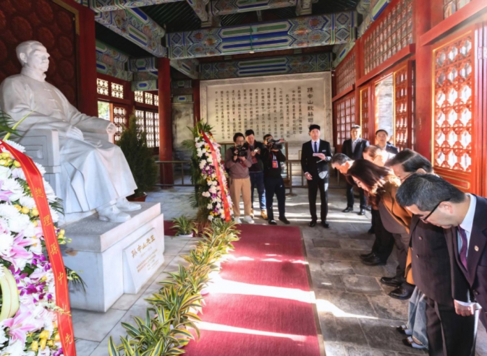 中國國民黨指出,鄭麗文主席注目凝視紀念堂左右牆壁上鐫刻的《孫中山先生致蘇聯遺書》和中山先生蓋棺、遺墨、遺著等文物。後拾級而上,向置於金剛寶座塔內的孫中山先生衣冠塚再次行三鞠躬禮,氣氛莊嚴。