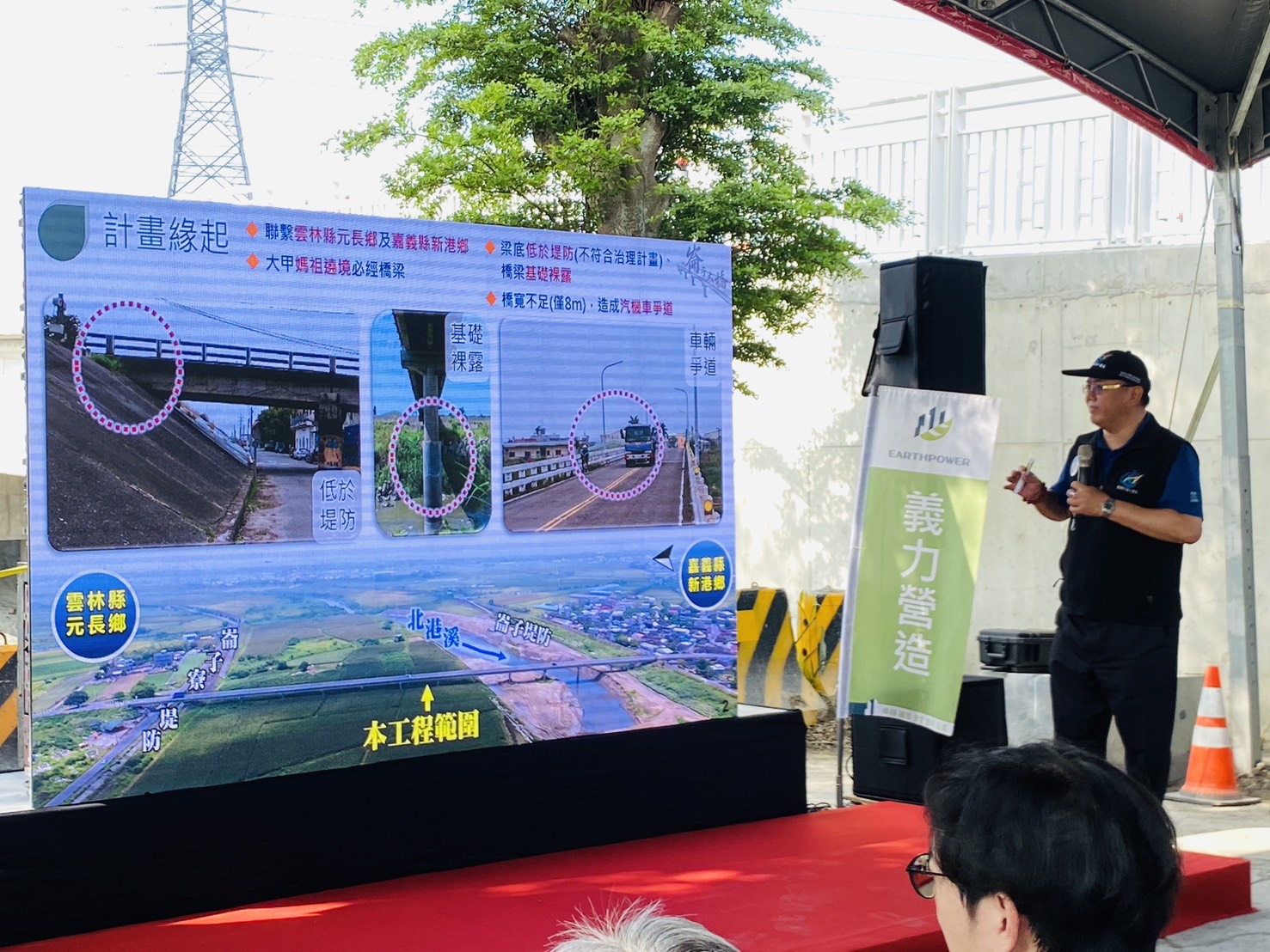雲林縣交通工務局長汪令堯表示,本工程由台灣世曦工程顧問公司負責設計監造,義力營造承攬施工,採預力樑與箱型預力梁結構設計,兼顧耐久性與安全性。施工方式採「半半施工」分兩階段進行,先完成北上線並導引車流改道新橋,再拆除舊橋進行南下線重建,以降低施工期間對交通衝擊。