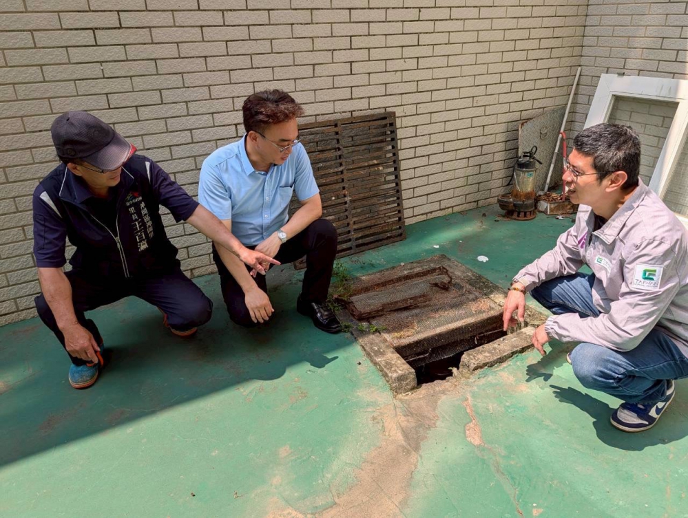 周永鴻說明,神岡國小北棟地下室設有攀岩場、彈簧床、跳高墊、體適能活動軟墊等多項運動設備,供師生體育課、課後活動及社區民眾運動使用。但地下室因地形較低且上方無遮蔽,每逢大雨雨水大量灌入,排水系統來不及處理,導致嚴重積水,設備反覆泡水毀損。今天邀請教育局到場實地了解現況,希望盡快核定經費、儘早施作。