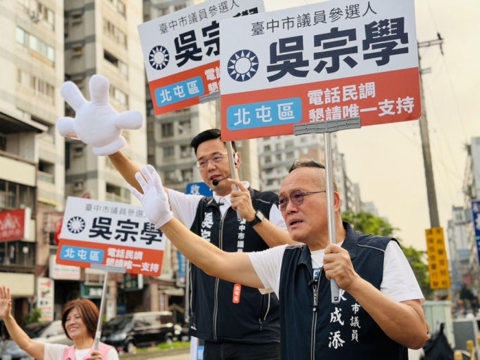 【記者林獻元台中報導】國民黨台中市北屯區議員初選電話民調啟動,地方基層的傳承與團結成為各參選人勝選核心。16日民調首日,台中市議員陳成添親自陪同接班人吳宗學走上街頭,於松竹路與昌平路口向市民致意。陳成添感性表態,強調兩人堅強的師徒情誼與傳承關係。