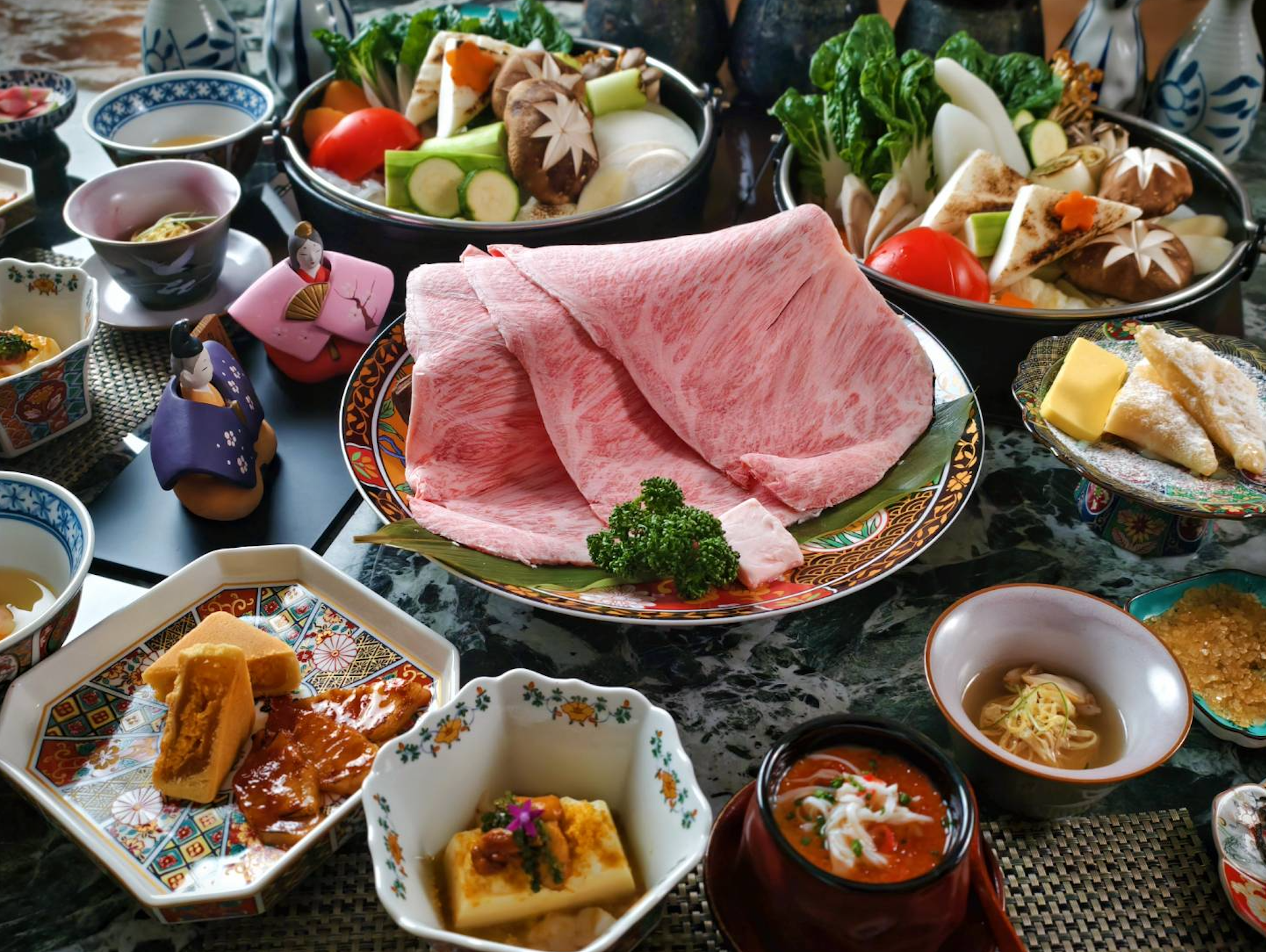 料理設計上,以關西風壽喜燒為主軸,從高溫鑄鐵鍋輕刷和牛油開始,經由蔥香、糖香層層堆疊,帶出經典甜鹹交織的迷人風味。前菜「日本海膽烏魚子粉豆腐」、溫潤細膩的「帝王蟹茶碗蒸」,以及茶香清雅的「玉露鮮蝦真丈湯」,層層鋪陳出日料的細膩節奏,為主餐揭開序幕。