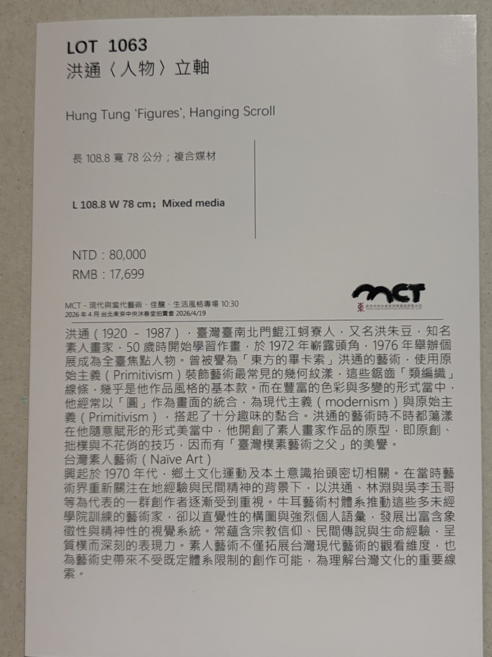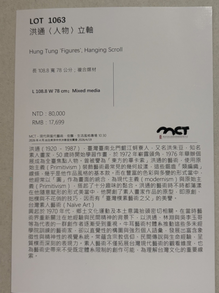 (本報記者/胡真語圖:林國豐台北報導)由台北東京中央沐春堂拍賣公司在台北文華東方酒店敦化北路158號B1從115年4月17日至19日舉行拍賣物件的預展1 9日正式啟拍。其實有民俗專家指出天上是火地上是火,所以今年可能有停電火災淹水等天災及缺水等。也因如此真元殿主說今年是投資古董字畫藝術品最好的時機,因為收藏家缺錢,現在是買方市場,所以現在在台灣的投資日後到香港或是法國拍賣的時候可以賺取很多倍的資金收穫有興趣投資的趕快把握機會。因為這兩三年地球磁場的變化容易造成人心的不穩定發生戰爭不動產容易破損,所以倒不如去投資隨手可得的物件,日後可以變賣現金比什麼都好。