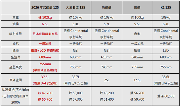2026 年式迪爵 125 採取的正是這種「精準配備、直接折讓」的實用策略:它不僅以平均 60.9 km/L 的一級油耗對抗油價波動,讓上班族實現「一杯咖啡錢騎一個月」的經濟效益;更標配 37.5L 同級最深大車廂與 260mm 寬敞腳踏,解決載物與接送的實用機能。安全層面則同樣紮實,標配 CBS 2.0 連動煞車與零後仰懸吊確保行車安穩。