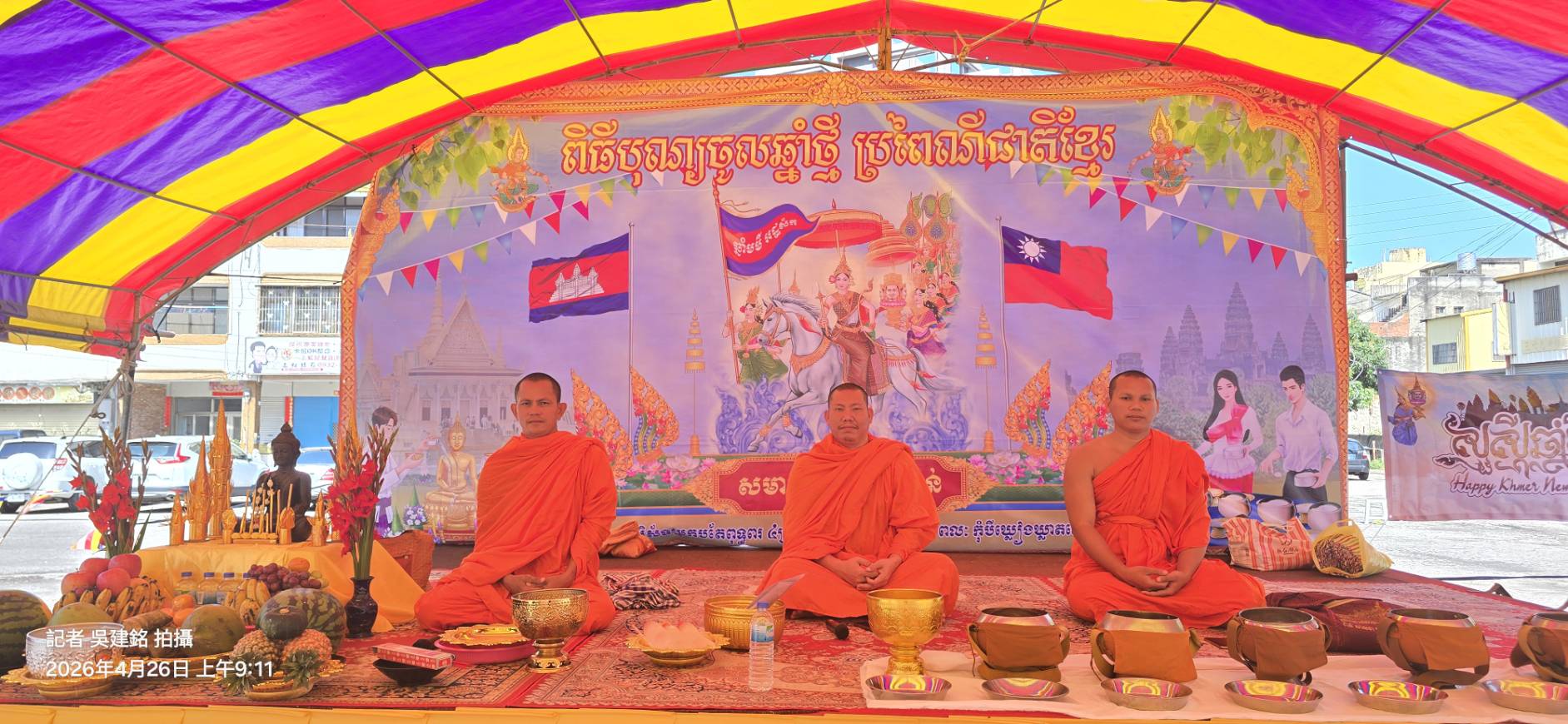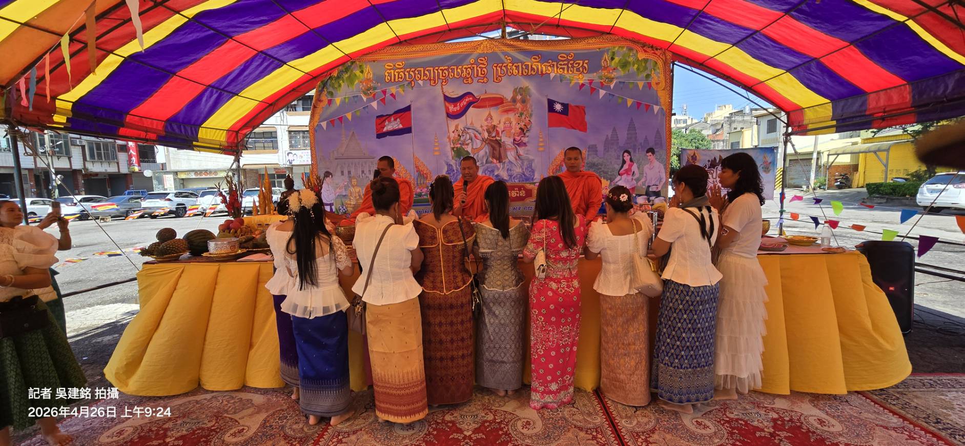 活動開始、慈悲的柬埔寨僧侶便在會場中為所有參與者進行了莊嚴的祈福儀式、為節日增添了一份神聖與祥和的氣息、也藉此祈求來年國泰民安、家庭幸福、隨後整個會場便被濃郁的柬埔寨風情所籠罩、精緻的柬埔寨傳統裝飾、如色彩斑斕的布藝、手工編織的飾品、與悠揚動人的傳統柬埔寨音樂交織在一起、營造出一個彷彿置身於傳統高棉土地上的沉浸式體驗、參與者們、特別是眾多柬埔寨新娘、身著鮮豔亮麗的民族服飾、如同盛開在異鄉的嬌豔花朵、為現場增添了無限的生命力與視覺饗宴。